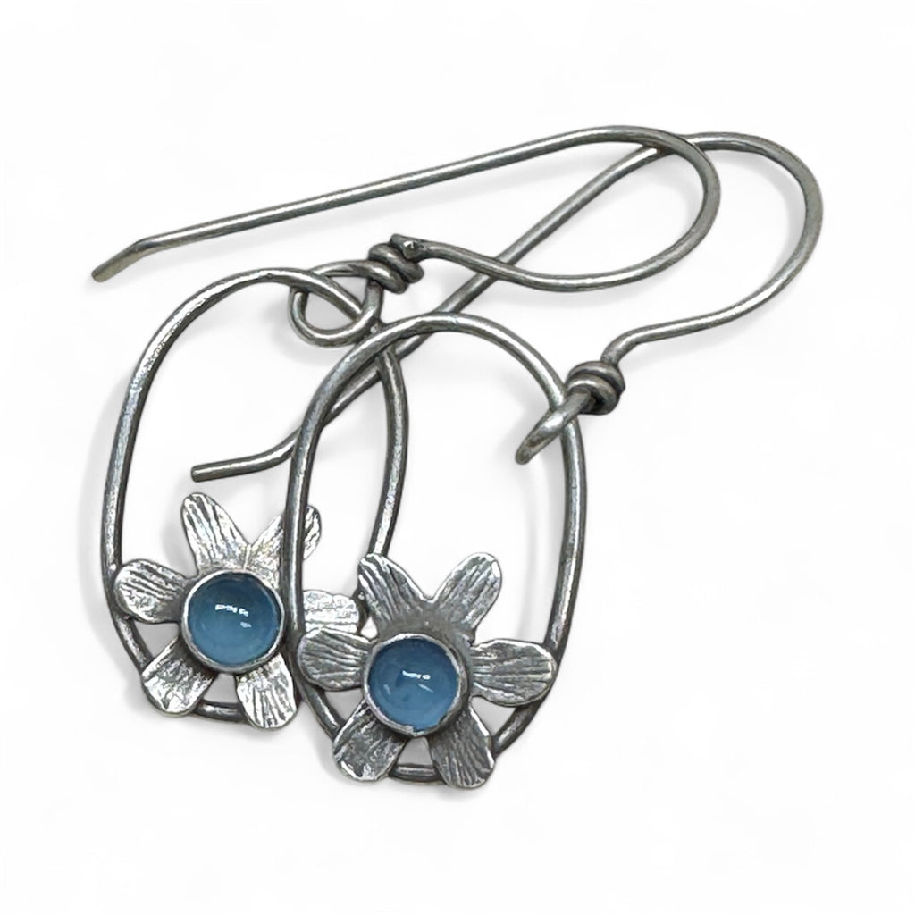 Part of my flower collection, these earrings are playful and whimsical 5m round blue chalcedony stones set into hand forged little flowers with a silver ring. They hand on handmade oxidized earwires.