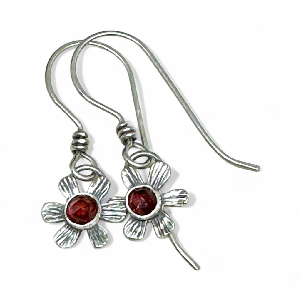 Part of my flower collection, these earrings are playful and whimsical 5m round garnet stones set into hand forged little flowers. They hand on handmade oxidized earwires.
