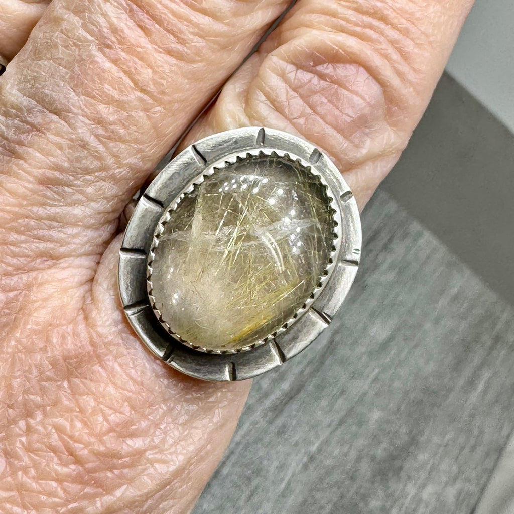 It’s oxidized and tumbled to give a matte brushed finish. The band is a double wire sterling silver. Hammered think bezel.