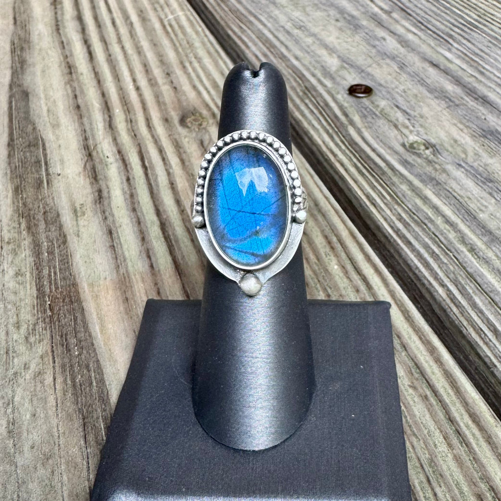This stunning Labradorite ring features a chunky and thick patterned band, showcasing the natural and unique flash of the Labradorite stone. Made with sterling silver, this ring is both beautiful and durable. Elevate any outfit with this statement piece.