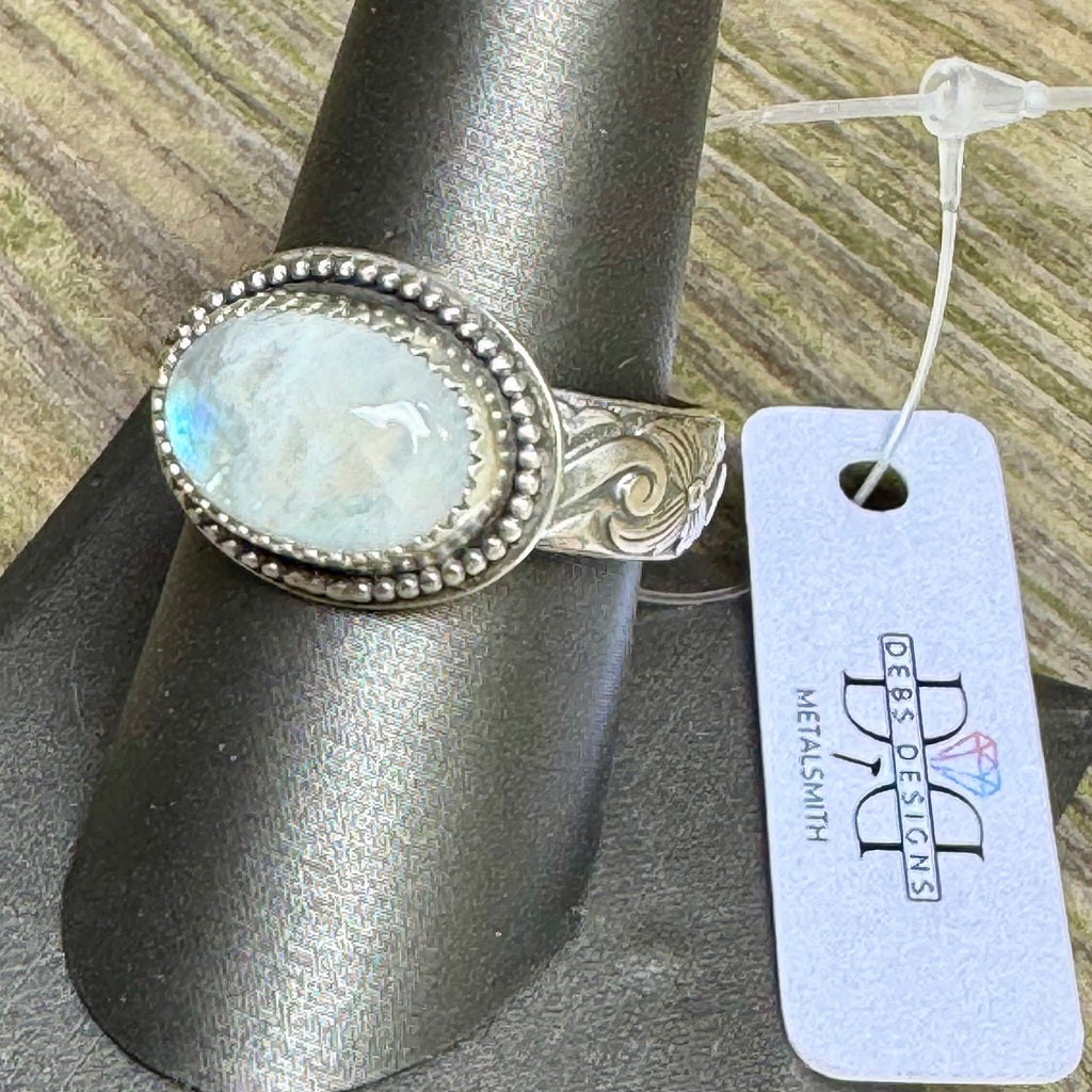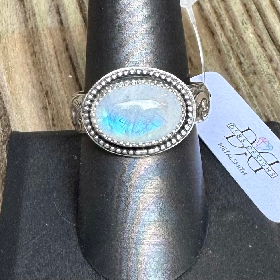 It’s oxidized and tumbled to give a matte brushed finish. The band is thick patterned sterling silver that was thoughtfully made with sterling wire and sheet. Small beaded wire surrounding the stone.