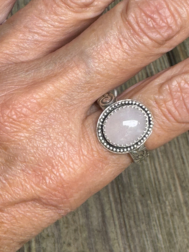 It’s oxidized and tumbled to give a matte brushed finish. The band is thick patterned sterling silver that was thoughtfully made with sterling wire and sheet. Small beaded wire surrounding the stone.